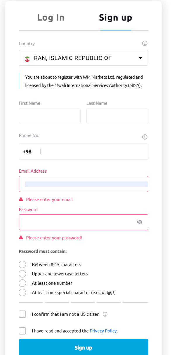 دومین نکته، دسترسی ایرانیان به خدمات این بروکر است. با توجه به تحریمها و محدودیتهای موجود، برخی بروکرهای خارجی امکان ثبتنام برای ایرانیان را ندارند. بنابراین، پیش از هر اقدامی، بهتر است با بخش پشتیبانی WM Markets تماس بگیرید و از امکان فعالیت به عنوان یک معاملهگر ایرانی مطمئن شوید.