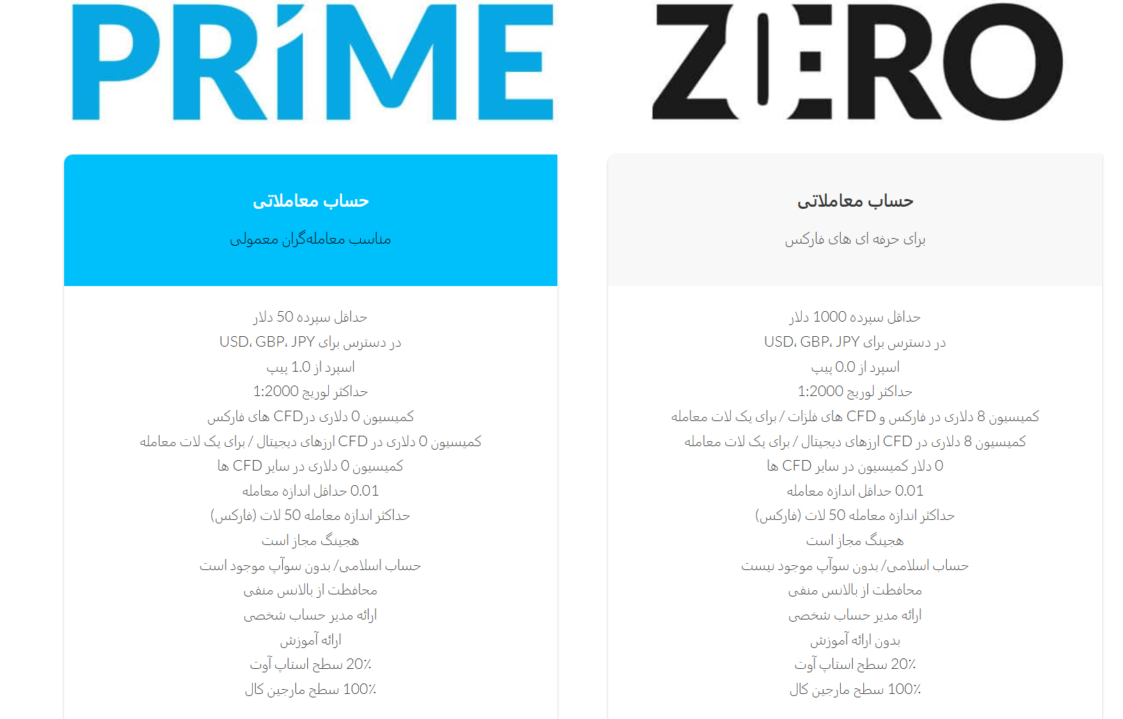 | کمیسیون | بله (بسته به حجم معاملات) | خیر | بله (کمیسیون کمتر) | کمیسیون برای حسابهای زیرو و پرایم محاسبه میشود و به ازای هر لات معامله در نظر گرفته میشود. |